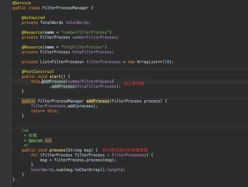 这样在初始化时需要将这些处理 handle 都加入责任链中,同时提供一个 API 供客户端执行即可。
