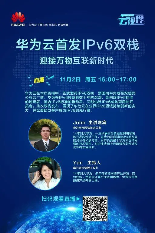 识别二维码,立即参与华为云IPv6双栈首发直播