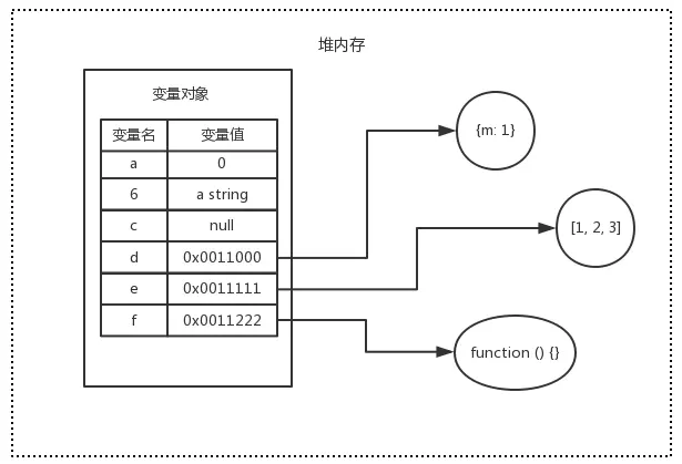var d = { m: 1 } // 变量d存在于变量对象中,{m: 1} 作为对象存在于堆内存中