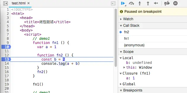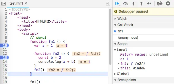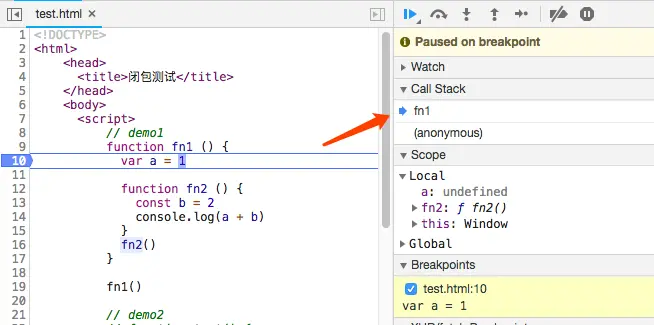 在函数fn1内部定义一个函数fn2,fn2内访问fn1的变量,并把fn2作为返回值,在外部执行fn2的时候,就访问到fn1的局部变量了。 这就形成了闭包,有些地方称fn1是闭包,有的称fn2为闭包, 我们和chrom保持一致,称父函数fn1为闭包。
