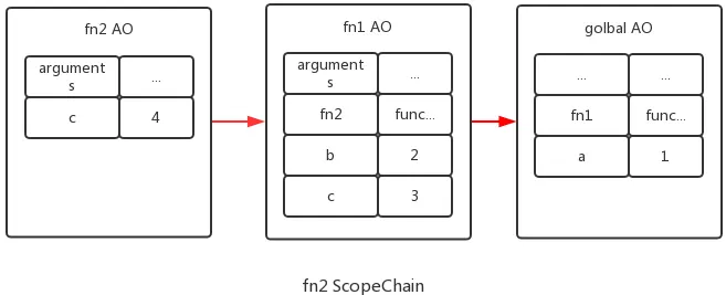 此时:fn2 ScopeChain = [fn2 VO, fn1 VO, global VO], 因此fn2能访问b, 但不能访问c, fn1执行完了,fn1已经出栈,但是fn1并没有被释放。