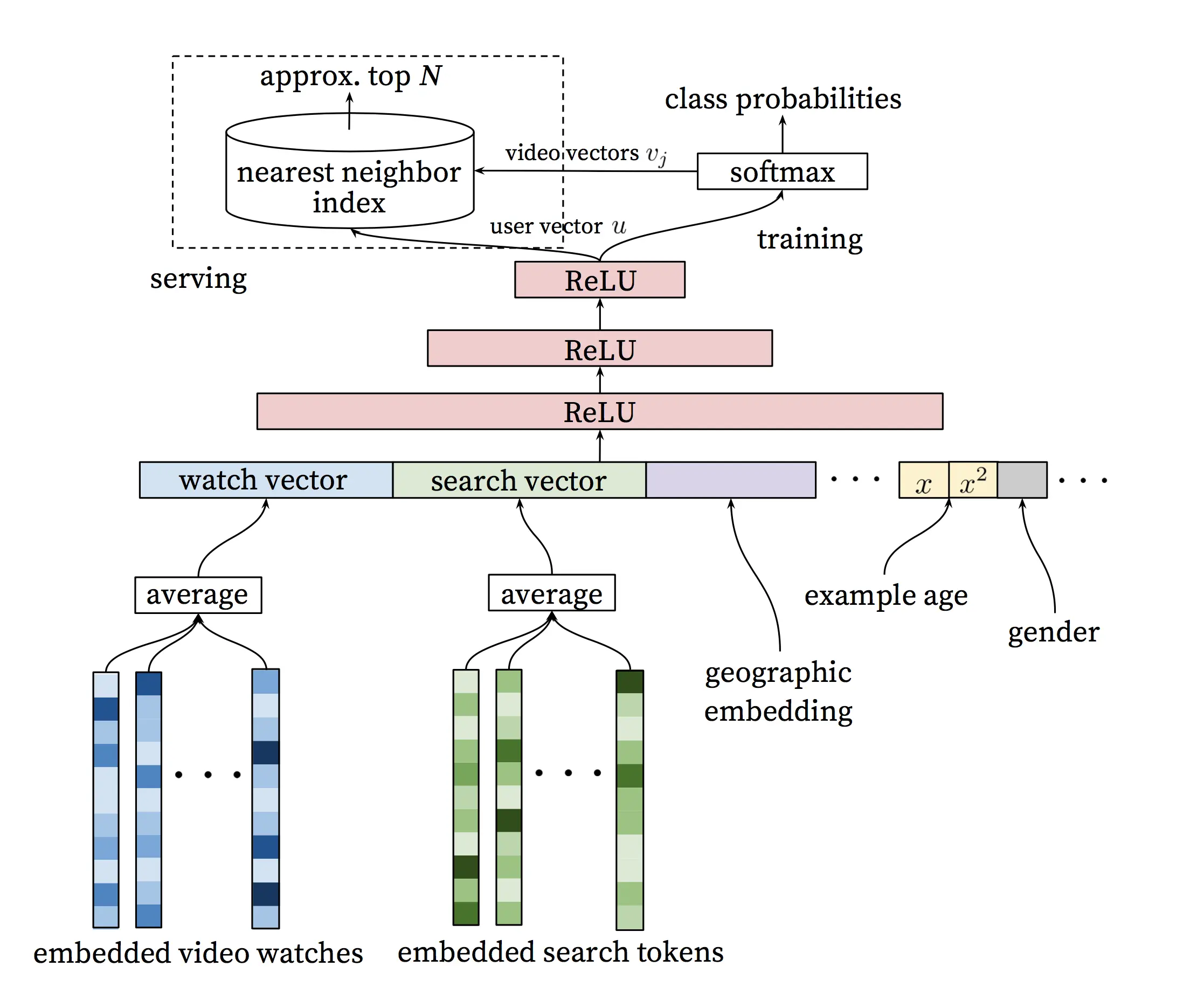 在实际进行服务时,YouTube并不追求完整的softmax过程,而是使用最近邻算法来选择最有可能的N个结果。