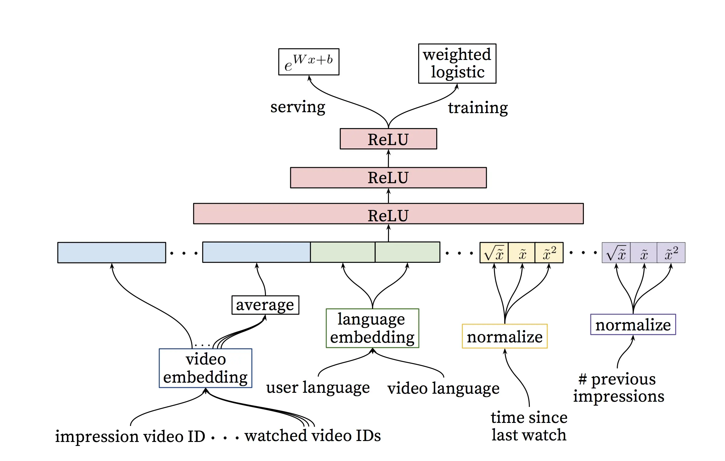 ,并使用softmax选择最有可能被观看的video。模型使用implicit feedback进行训练,用户观看完视频作为正样本。