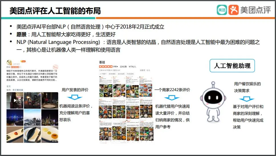 我们希望在不久的将来,当用户发表一条评价的时候,能够让机器阅读这条评价,充分理解用户的喜怒哀乐。当用户进入大众点评的一个商家页面时,面对成千上万条用户评论,我们希望机器能够代替用户快速地阅读这些评论,总结商家的情况,供用户进行参考。未来,当用户有任何餐饮、娱乐方面的决策需求的时候,美团点评能够提供人工智能助理服务,帮助用户快速的进行决策。