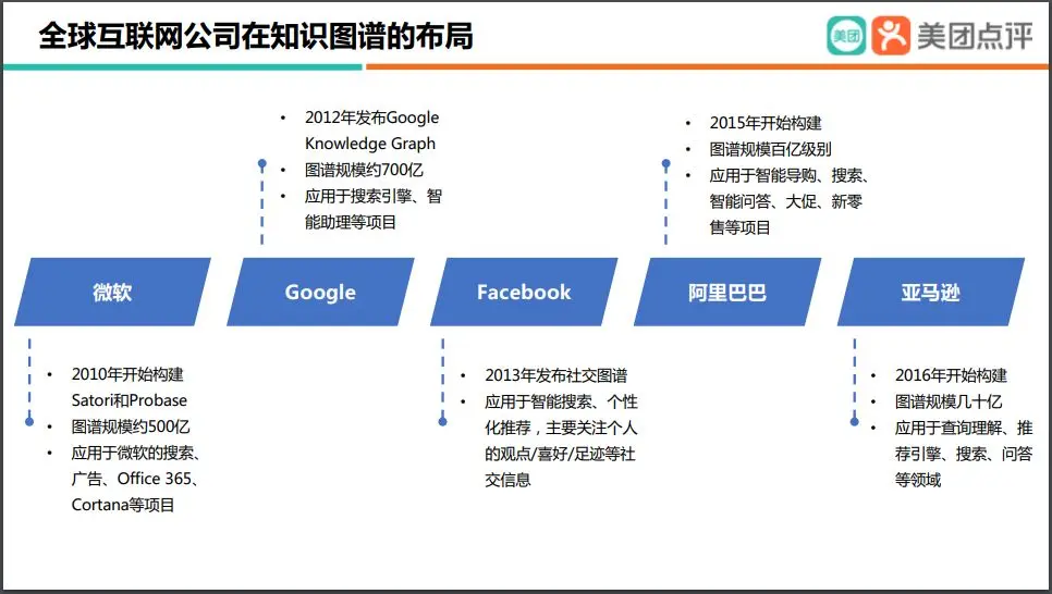 全球的互联网公司都在积极布局知识图谱。早在 2010 年微软就开始构建知识图谱,包括 Satori 和 Probase。2012 年,Google 正式发布了 Google Knowledge Graph,现在规模已经达到 700 亿左右。目前微软和 Google 拥有全世界最大的通用知识图谱,Facebook 拥有全世界最大的社交知识图谱,而阿里巴巴和亚马逊则分别构建了商品知识图谱。