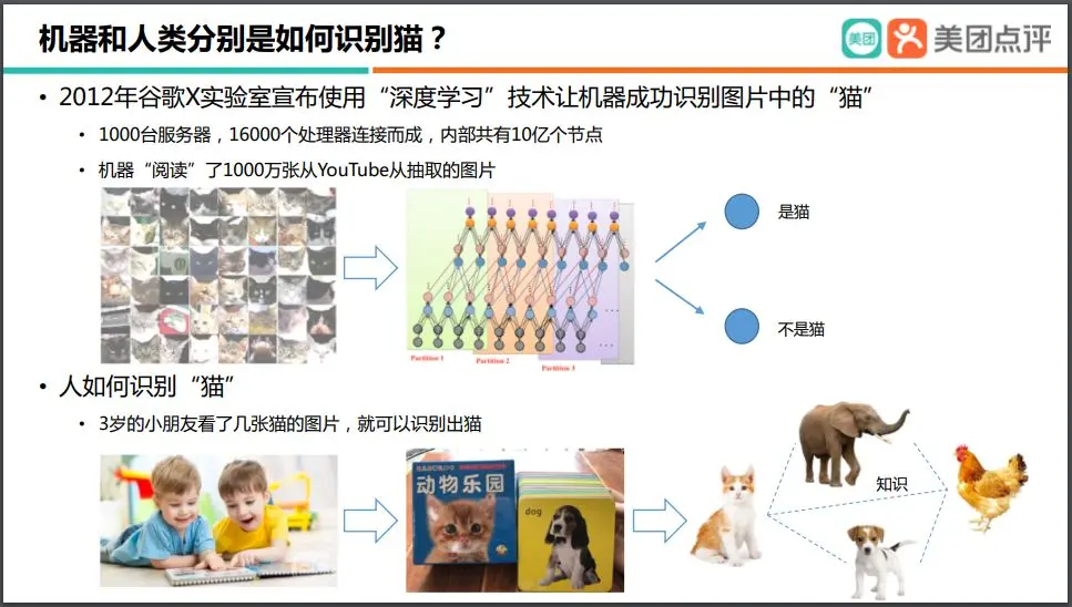2012 年,Google X 实验室宣布使用深度学习技术,让机器成功识别了图片中的猫。它们使用了 1000 台服务器,16000 个处理器,连接成一个 10 亿节点的人工智能大脑。这个系统阅读了 1000 万张从 YouTube 上抽取的图片,最终成功识别出这个图片中有没有猫。