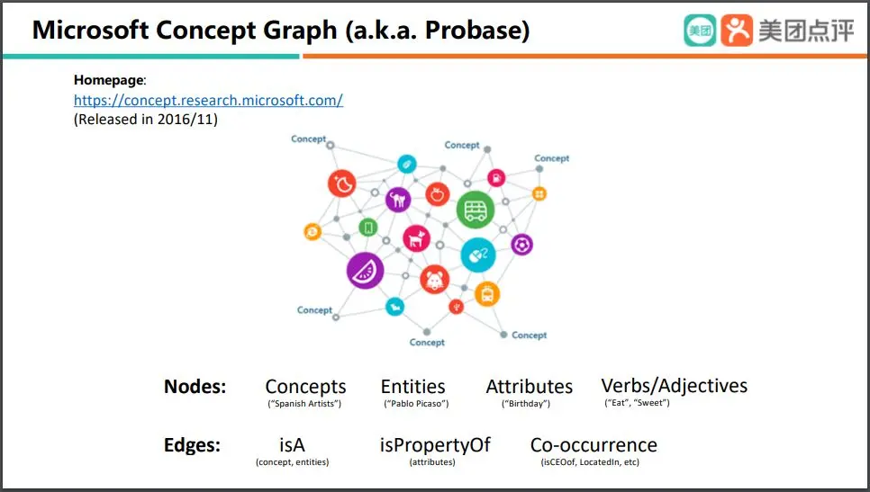Microsoft Concept Graph 于 2016 年 11 月正式发布,但是它早在 2010 年就已经开始进行研究,是一个非常大的图谱。在这个图谱里面有上百万个 Nodes(节点),这些 Nodes 有Concepts(概念),比如说 Spanish Artists(西班牙艺术家);有 Entities(实体),比如说 Picasso(毕加索);有 Attributes(属性),比如 Birthday(生日);有 Verbs(动词),有 Adjectives(形容词),比如说 Eat、Sweet。也有很多很多的边,最重要的边,是这种 isA 边,比如说 Picasso,还有 isPropertyOf 边。对于其他的 Relation,我们会统称为 Co-occurance。