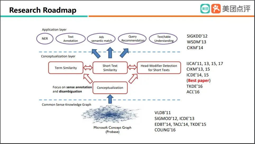 这是我们在微软亚洲研究院期间对 Common Sense Knowledge Graph 的 Research Roadmap(研究路线图)。当我们构建出 Common Sense Knowledge Graph 之后,重要的是在上面构建各种各样的模型。我们提出了一些模型叫 Conceptualization(概念化模型),它能够支持 Term Similarity、Short Text Similarity 以及 Head-Modifier Detection,最终支持各种应用,比如 NER、文本标注、Ads、Query Recommendation、Text Understanding 等等。