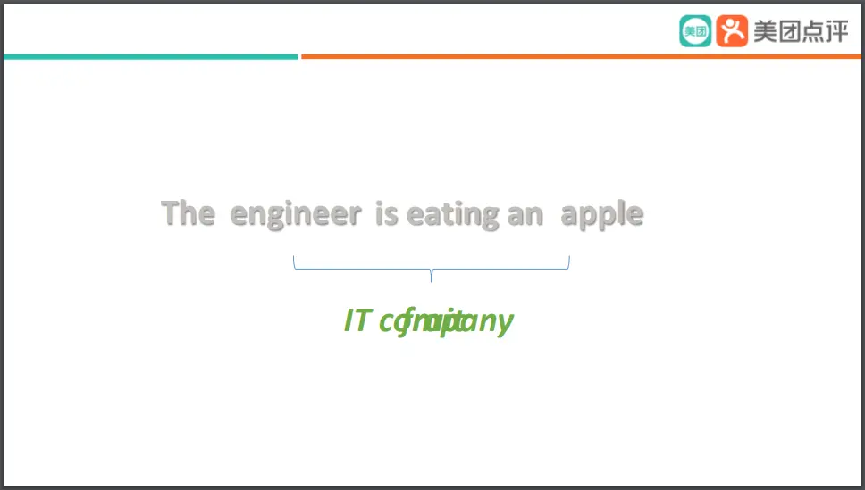 再比如,当我们看到 Engineer 和 Apple 的时候,我们会对 Apple 做一些推理,认为它就是一个 IT Company,但是如果再多给一些上下文信息,在这个句子里面由于 eating 的出现,我相信大家的大脑也会一样地做出常识推理,认为这个 Apple 不再是代表 Company,而是代表 Fruit。