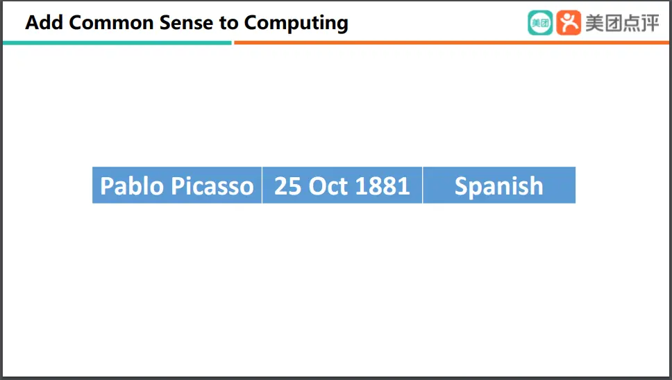 当大家看到上面中间的文本时,相信所有人都能够认出这应该是一个日期,但是大家没办法知道这个日期代表什么含义。但如果我们再多给一些上下文信息,比如 Picasso、Spanish等等,大家对这个日期就会有一些常识性的推理。我们会猜测这个日期很可能是 Picasso 的出生日期,或者是去世日期,这就是常识。