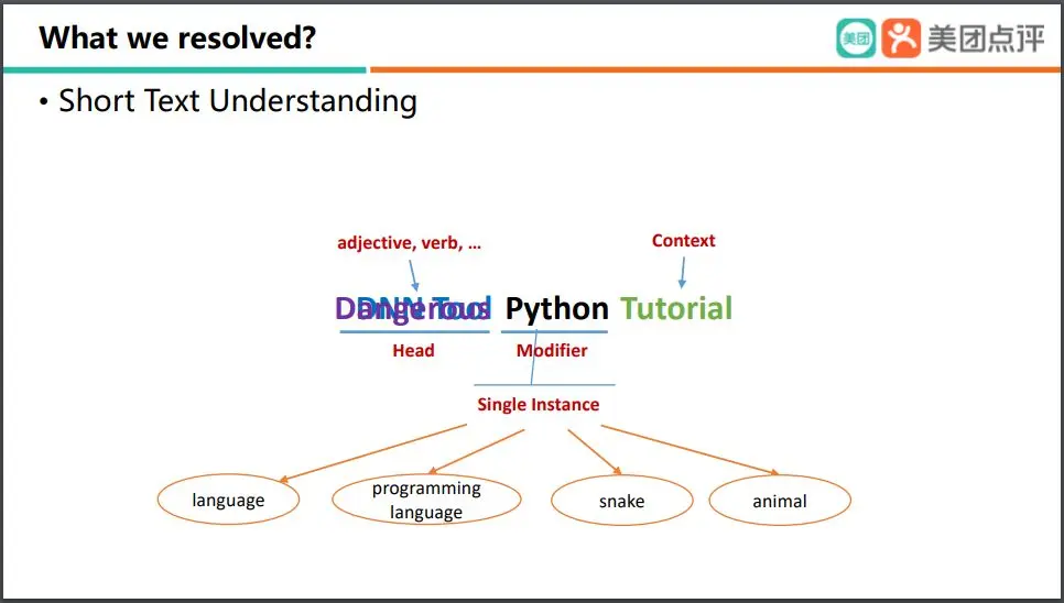通过这样的一个 Conceptualization Model,我们能够解决什么样的文本理解问题?我们可以看这样一个例子。比如说给定一个非常短的一个文本 Python,它只是一个 Single Instance,那么我们会希望将它映射到至少两大类的 Concept 上,一种可能是 Programming Language,另外一种是 Snake。当它有一些 Context,比如说 Python Tutorial 的时候,那么这个时候 Python 指的应该是 Programming Language,如果当它有其他的 Adjective、Verb,比如有 Dangerous 时,这时候我们就会将 Python 理解为 Snake。