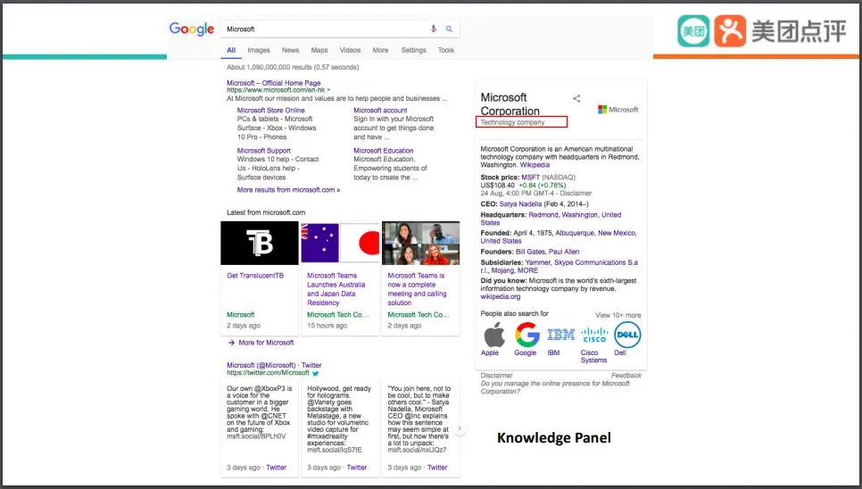 下面我们将简单地介绍一下,具体应该怎么去做。当我们在 Google 里搜一个 Single Instance 的时候,通常在右侧会出现这个 Knowledge Panel。对于 Microsoft 这样一个 Instance,我们可以看到这个红色框所框出来的 Concept,Microsoft 指向的是 Technology Company,这背后是怎么实现的?