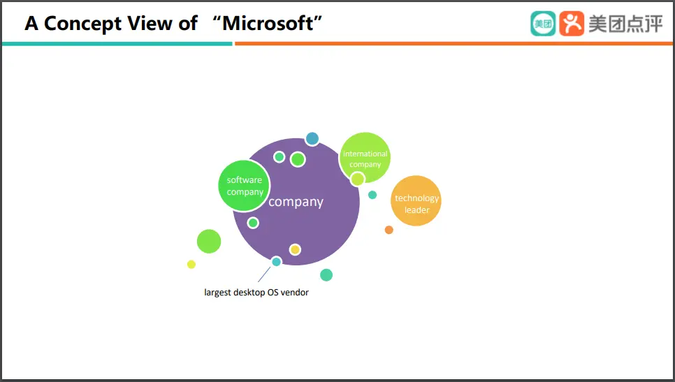 如果将它映射到 Company 这个 Concept 上,很显然它是对的,但是我们却没办法将 Microsoft 和 KFC、BMW 这样其他类型的产品区分开来。另外一方面,如果我们将 Microsoft 映射到 Largest Desktop OS Vendor 上,那么这是一个非常 Specific 的 Concept,这样也不太好,为什么?因为这个 Concept 太 Specific,太 Detail,它可能只包含了 Microsoft 这样一个 Entity,那么它就失去了 Concept 的这种抽象能力。