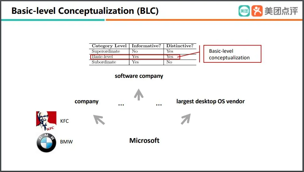 所以我们希望将 Microsoft 映射到一个既不是特别 General(抽象),又不是一个特别 Specific(具体)的 Concept 上。在语言学上,我们将这种映射称之为 Basic-level,我们将整个映射过程命名为 Basic-level Conceptualization。
