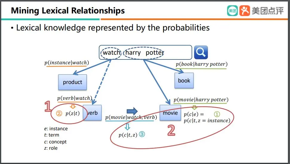 那么我们来看一看应该怎样去解决这样一件事情。当我们看到 Watch Harry Potter 时,我们首先要知道,Harry Potter 有可能是一本 Book,也有可能是一部 Movie。我们可以算出一个先验概率,这通常要通过大规模的统计。同时我们要知道,Watch 它有可能是一个名词,同时它也有可能是一个动词,并且我们还需要去挖掘,当 Watch 作为动词的时候,它和 Movie 有非常紧密的关联。