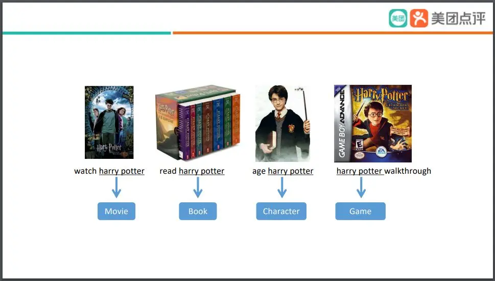 除了刚才这样一个 General Context 以外,在很多时候这些 Text 可能还会包含很多一些特殊的类型,比如说 Verb、Adjective。具体而言,我们希望在看到 Watch Harry Potter 时,能够知道 Harry Potter 是 Movie,当我们看到 Read Harry Potter 时,能够知道 Harry Potter 是 Book。同样的,Harry Potter 还有可能是一个角色名称,或者是一个游戏名称。