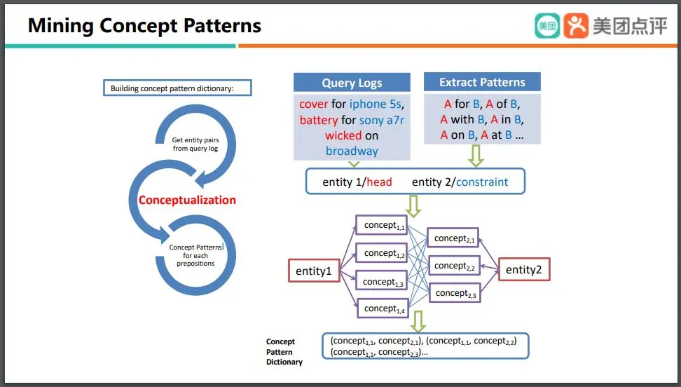 我们再来看一下,如果一个文本里包含了 Multiple Entities,要怎样处理?我们需要做知识挖掘,怎么做?首先我们可以得到非常多的 Query Log,然后我们也可以去预定一些 Pattern,通过这种 Pattern 的定义,可以抽取出非常多 Entity 之间 Head 和 Modifier 这样的 Relation,那么在接下来我们可以将这些 Entity 映射到 Concept 上,之后得到一个 Pattern。