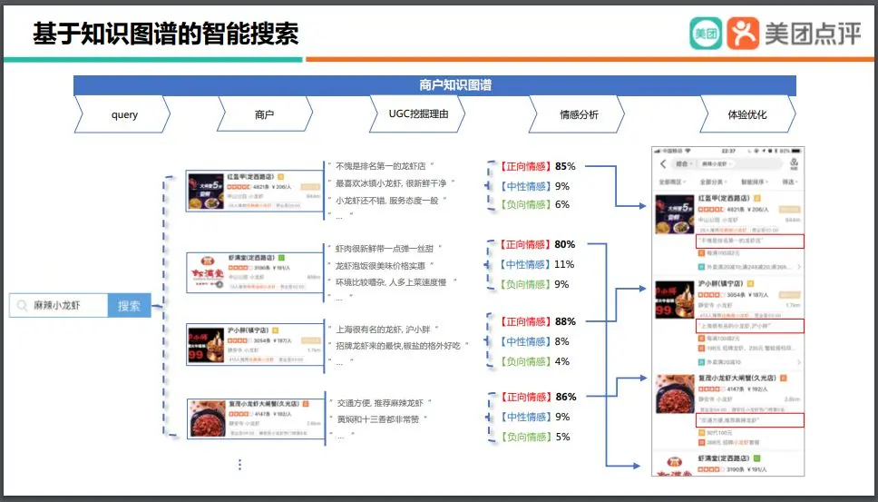 如何用知识图谱来改进我们的搜索?如果大家现在打开大众点评,搜索某一个菜品时,比如说麻辣小龙虾,其实我们的机器是已经帮大家提前阅读了所有的评价,然后分析出提供这道菜品的商家,我们还会根据用户评论的情感分析结果来改进这些搜索排序。