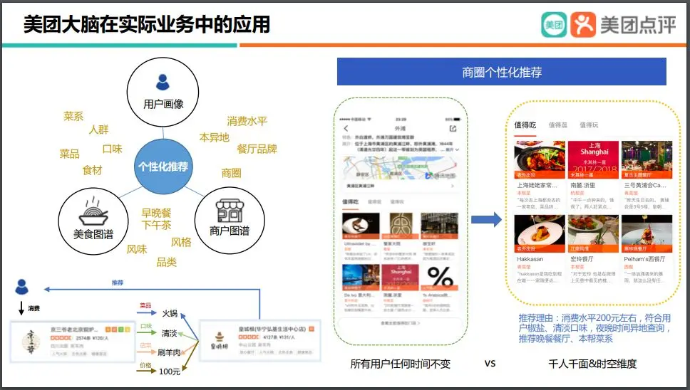 此外,我们也将它用在商圈的个性化推荐。当大家打开大众点评时,如果你现在位于某一个商场或者商圈,那么大家很快就能够看到这个商场或者商圈的页面入口。当用户进入这个商场和商户页面时,通过知识图谱,我们就能够提供“千人千面”的个性化排序和个性化推荐。