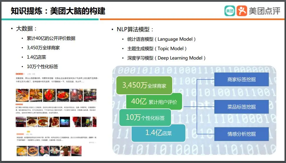 我们简单地介绍一下美团大脑是如何进行构建的。我们会使用 Language Model(统计语言模型)、Topic Model(主题生成模型) 以及 Deep Learning Model(深度学习模型) 等各种模型,希望能够做到商家标签的挖掘,菜品标签的挖掘和情感分析的挖掘等等。