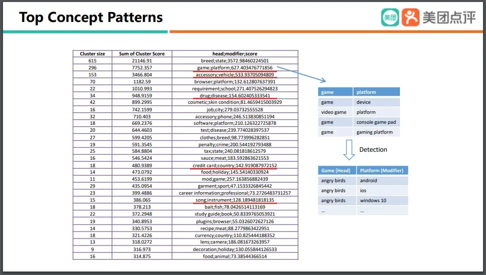 大家可以看一下我们能够挖掘出来的一些 Top 的 Concept Patterns,比如说 Game 和 Platform,就是一个 Concept 和一个 Pattern。它有什么用?举一个具体的例子,当用户在搜 Angry Birds、iOS 的时候,我们就可以知道用户想找的是 Angry Birds 这款游戏,而 iOS 是用来限制这款游戏的一个 Platform。苹果公司每年都会推出新版本的 iOS,那么我们挖掘出这样的 Concept Pattern 之后,不管苹果出到 iOS 15或者 iOS 16,那么我们只需要将它们映射到 Platform,那么我们的 Concept Patterns 就仍然有效,这样可以很容易地进行知识扩展。