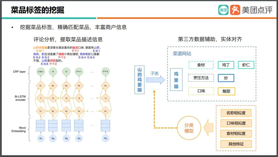 下面介绍一下我们如何对菜品进行标签的挖掘?我们使用了 Bi-LSTM 以及 CRF 模型。比如说从这个评论里面我们就可以抽取出这样的 Entity,再通过与其他的一些菜谱网站做一些关联,我们就可以得到它的食材、烹饪方法、口味等信息,这样我们就为每一个店菜挖掘出了非常丰富的口味标签、食材标签等各种各样的标签。