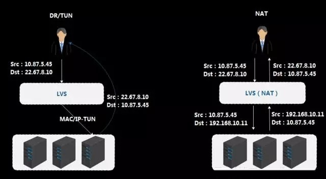 DR模式经过LVS之后,LVS会将MAC地址更改、封装MAC头,内层IP报文不动,报文经过LVS负载均衡查找到RS之后,将源MAC头改成自己的,目的MAC改成RS地址,MAC寻址是在二层网络里,对网络部署有一定的限定,在大规模分布式集群部署里,这种模式的灵活性没有办法满足需求;