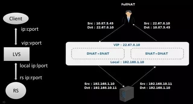 早期模式的各种限制制约了我们的发展,所以我们首先做了FullNAT,相比原来的NAT方式,FullNAT多了SNAT属性,将客户端的原IP地址作了转换;