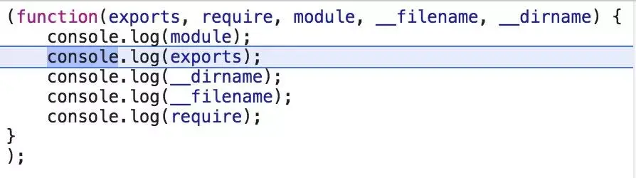 通过上图我们可以发现,module-var.js 文件中定义的内容,以 (function(){}) 这种形式被包装了。这里,我们就清楚了,模块中的 module、exports、__dirname、__filename 和 require 这些对象都是函数的输入参数,在调用包装后的函数时传入。这时第一个问题先告一段落,我们继续探究第二个问题。