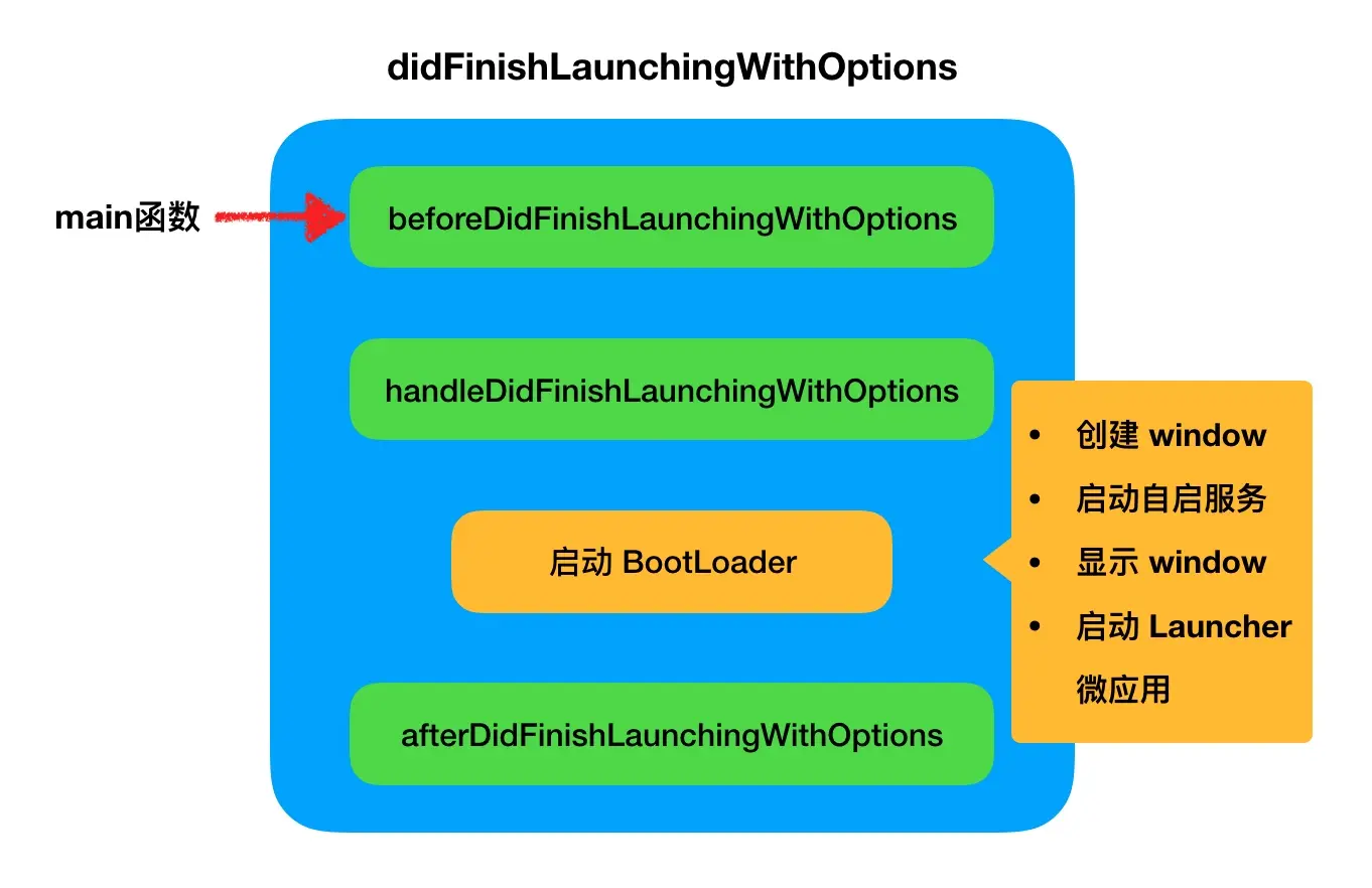 DTFrameworkInterface 在 afterDidFinishLaunchingWithOptions 之前会启动 BootLoader,执行 mPaaS 框架的初始化逻辑。在嵌入式操作系统中,BootLoader 的作用是初始化硬件设备,以便为最终调用操作系统内核准备好正确的环境。类似的在 mPaaS 框架中,BootLoader用来初始化整个 mPaaS 框架环境,默认实现为依次执行下面的流程:
