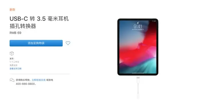 新款 iPad Pro 在改用 USB-C 接口后,也随即取消了 3.5 mm 耳机接口。但是,苹果并没有像在 iPhone 7 上首次取消耳机接口一样随机附赠一个 Lightning 转 3.5 mm 耳机插孔转换器,如果你想在新款 iPad Pro 上使用 3.5 mm 接口的耳机,你必须自行购买一个 USB-C 转 3.5 mm 耳机插孔转换器,官网 售价 69 人民币。