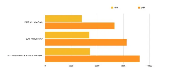 从上图中可以看到,新款 MacBook Air 的单核和多核跑分都处于 2017 Mid 基础款的 MacBook 和 2017 Mid 款不带 Touch Bar 的 MacBook Pro 的中间,这其实也非常契合新款 MacBook Air 的定价策略。