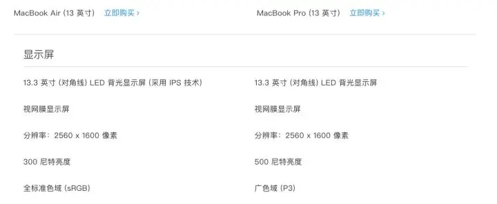 旧款 MacBook Air 的大颗粒屏幕终于成为了历史,新款 MacBook Air 也换上了 Retina 屏幕。可是,这块屏幕和 MacBook Pro 的屏幕有区别吗?苹果当然不会在发布会上说,唯一的线索是「可显示的色彩比上一代增加 48%」。