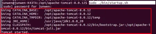 Using CATALINA_BASE: /opt/apache-tomcat-8.0.12Using CATALINA_HOME: /opt/apache-tomcat-8.0.12Using CATALINA_TMPDIR: /opt/apache-tomcat-8.0.12/tempUsing JRE_HOME: /usr/java/jdk1.8.0_20Using CLASSPATH: /opt/apache-tomcat-8.0.12/bin/bootstrap.jar:/opt/apache-tomcat-8.0.12/bin/tomcat-juli.jarTomcat started.
