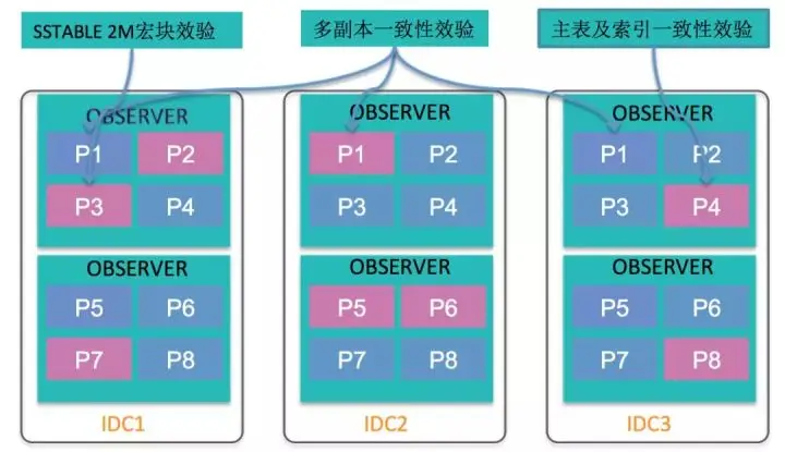 当发现不一致时自动进行异常副本的替换。另一方面主表和索引表的数据同样会做一致性校验,保障数据在主表和索引表之间的一致性。出于对数据正确性的敬畏,数据校验是OceanBase内部对自己的一道防火墙。