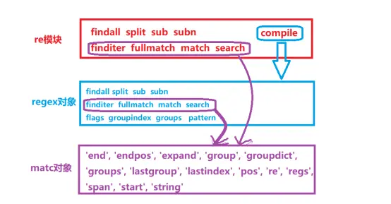 有上图我们看出来,接下来我们要将的Python中re模块、regex对象、match对象三者之间是存在一定关系的。