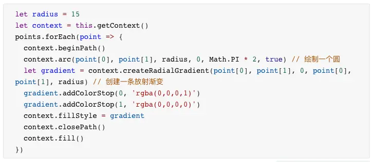 2.在地图上填充数据基于canvas绘制热力图时,热力图中每个数据点的半径大小会直接影响到热力图的展现效果,所以一般要结合使用地图的缩放级别以及数据精度来进行设置,本文示例默认设为15px。