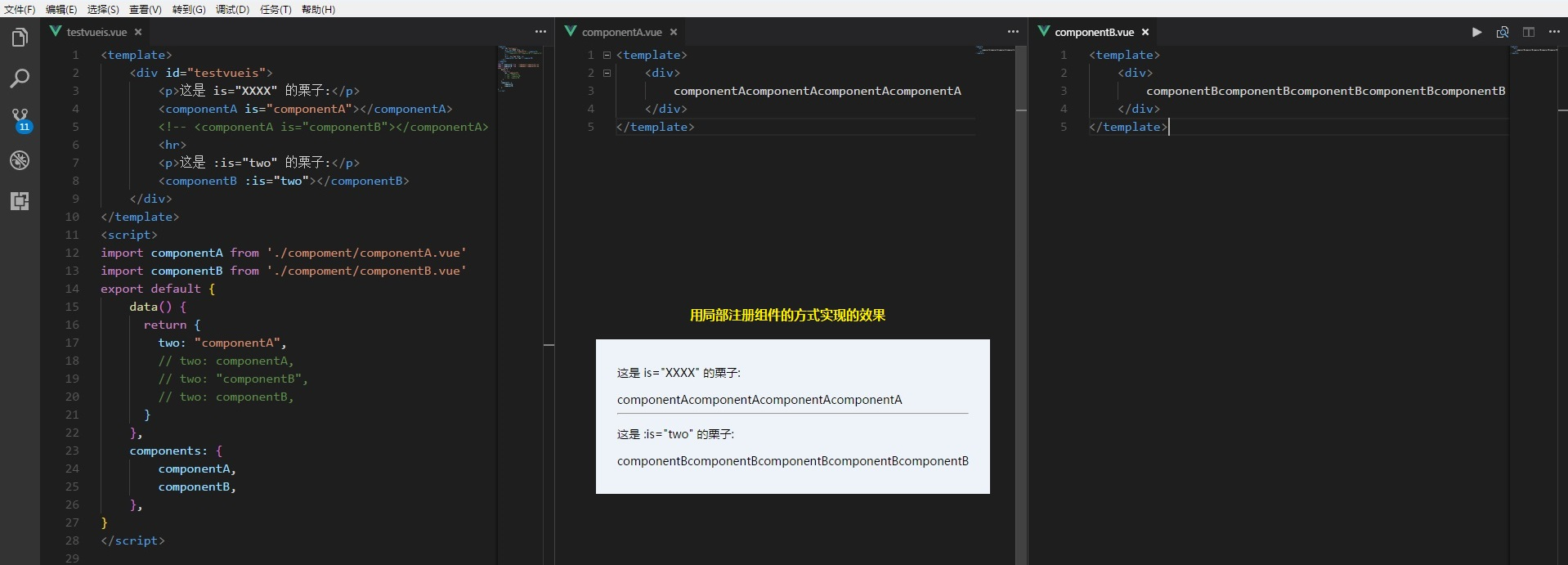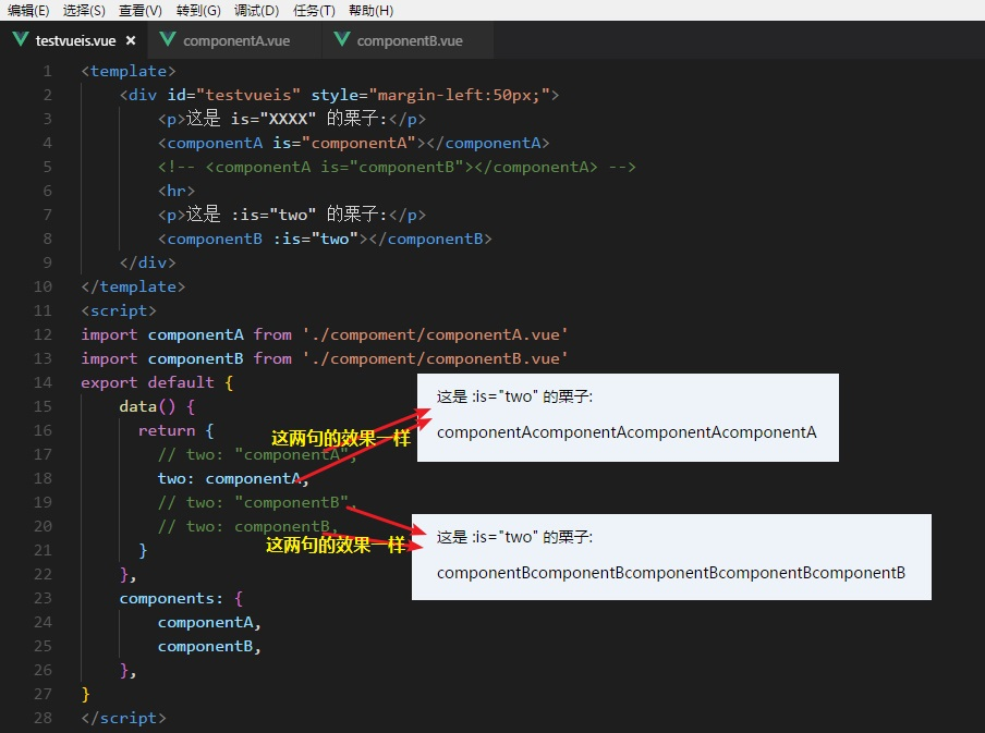 单独看自定义组件componentB,在父组件中能看到,是:is,这是数据绑定,那么被绑定的值必须在当前实例的data中定义。栗子中绑定的是two,two的值是什么那componentB就渲染什么。