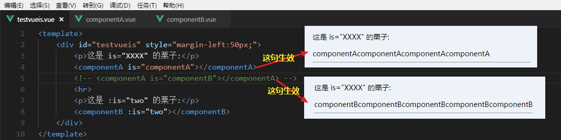 同样,如果把< componetB>换成< div>、< p>等等符合W3C的标签都能正常显示:is被赋值的组件的内容!这样就是动态组件了!
