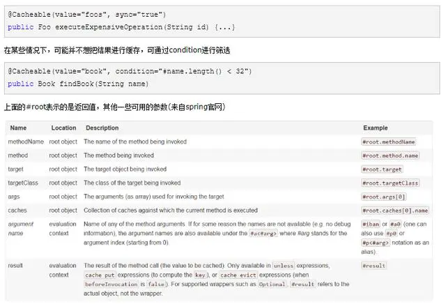 缓存都是通过key-value进行储存的,value或cacheNames必须指定(value是cacheNames的别名),指定多个value用(value = {"value1", "value2"})如果没有指定key,spring会提供一个默认的KeyGenerator,这个KeyGenerator根据参数生成key,如果方法没有参数返回KeyGenerator.EMPTY,如果有一个参数返回这个实例,如果有多个参数返回包含这些参数的SimpleKey。可以通过继承CachingConfigurerSupport自己指定KeyGenerator,类上加@Configuration注解。也可以像上面那样自己指定key,需要了解SPEL表达式。