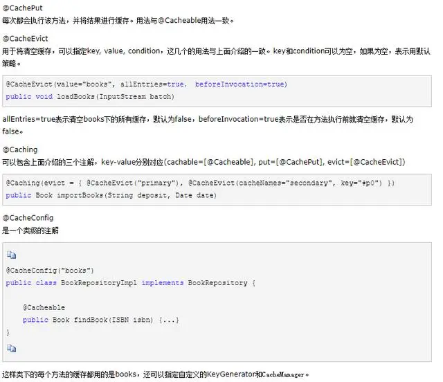 这个注解,会每次先检查是否执行过这个方法,在从缓存数据库中查看key是否相等,如果找到了,从缓存中读取,没有匹配的那么执行该方法,将结果缓存。顺便在此给大家推荐一个Java架构方面的交流学习群:698581634,进群即可获取Java架构师资料:有Spring,MyBatis,Netty源码分析,高并发、高性能、分布式、微服务架构的原理,JVM性能优化这些成为架构师必备的知识体系,群里一定有你需要的资料,大家赶紧加群吧。