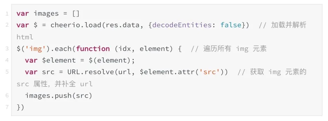 使用 cheerio 解析 html ,抓出所有的图片 url: