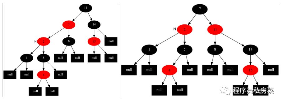 对于情况2:插入节点的父节点是红色,叔叔节点是黑色,且插入节点是其父节点的右子节点。我们要做的操作有:将当前节点(7)的父节点(2)作为新的节点,以新的当前节点为支点做左旋操作。完成后如左下图所示,这样左下图就变成情况3了。