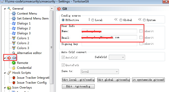 打开TortoiseGit设置页面,配置相关参数如下:配置用户名和邮箱,配置服务器代码路径和上面得到的id_rsa.ppk路径,进入TortoiseGit的Settings页面,点击左边导航栏的Git目录,设置用户名和邮箱(Name, Email),Name会在提交代码的时候显示出来,如果之前使用git config配置过,这里也可以不用配置的。