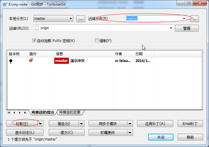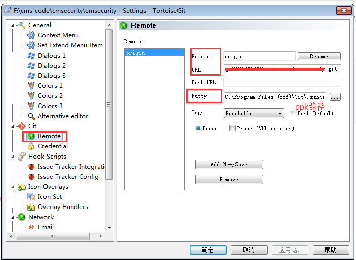 然后点击Git下的Remote菜单,添加一个origin远程仓库分之信息:Remote是为远程分之起个名字,URL是远程仓库地址,Putty是id_rsa.ppk文件路径,至此就可以使用TortoiseGit正常工作了,可以试试pull,commit等功能。