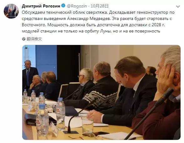 罗戈津在推特上称:“我们正在讨论火箭的技术概貌,总设计师向梅德韦杰夫做了报告。该型火箭将从俄罗斯东方航天发射场发射。其强大的能力应足以保障俄罗斯可以在 2028 年起将空间站舱段送上月球轨道乃至月面。”