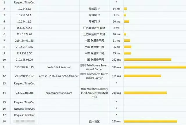 平均国内ping值217,表现不是很好,美国西部机房一遍都在200里面,看来波特兰机房国内用户少是有原因的,具体看下路由图: