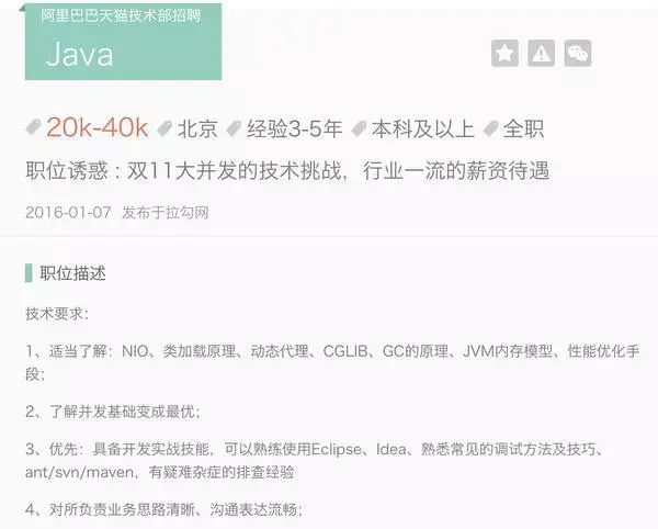 3. “具备开发实战技能,可以熟练使用Eclipse、Idea、熟悉常见的调试方法及技巧、ant/svn/maven,有疑难杂症的排查经验”->工作一段时间都会吧?ant和svn完全不够酷,看得出来要么阿里的人比较守旧(或者懒),要么阿里的技术很老土。