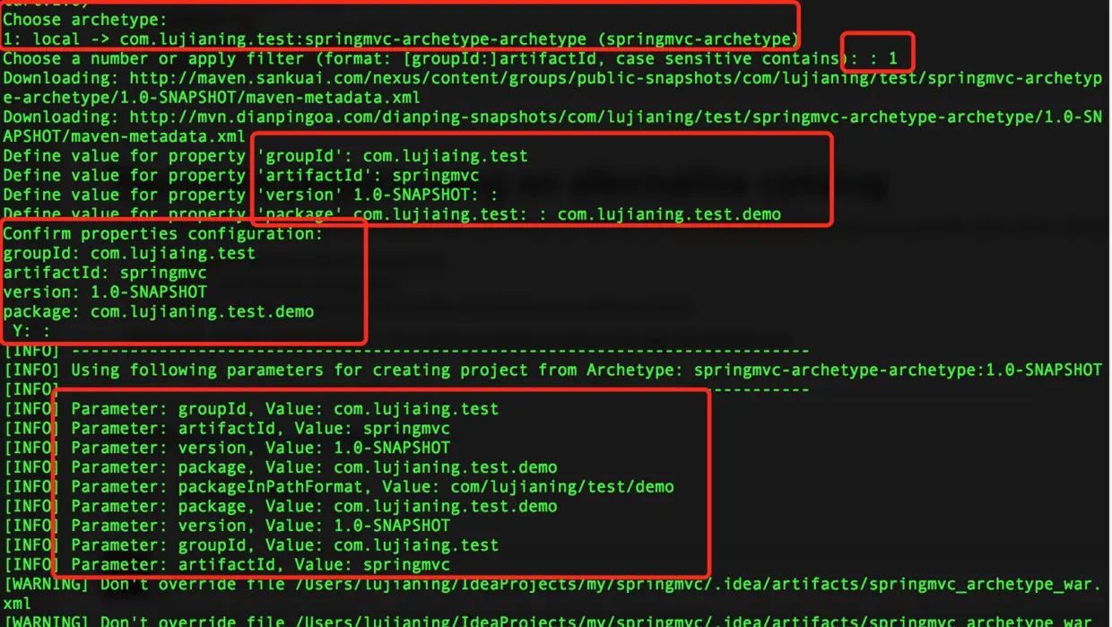 - 提示输入一些基本参数,如groupId,artifactId,version,package等