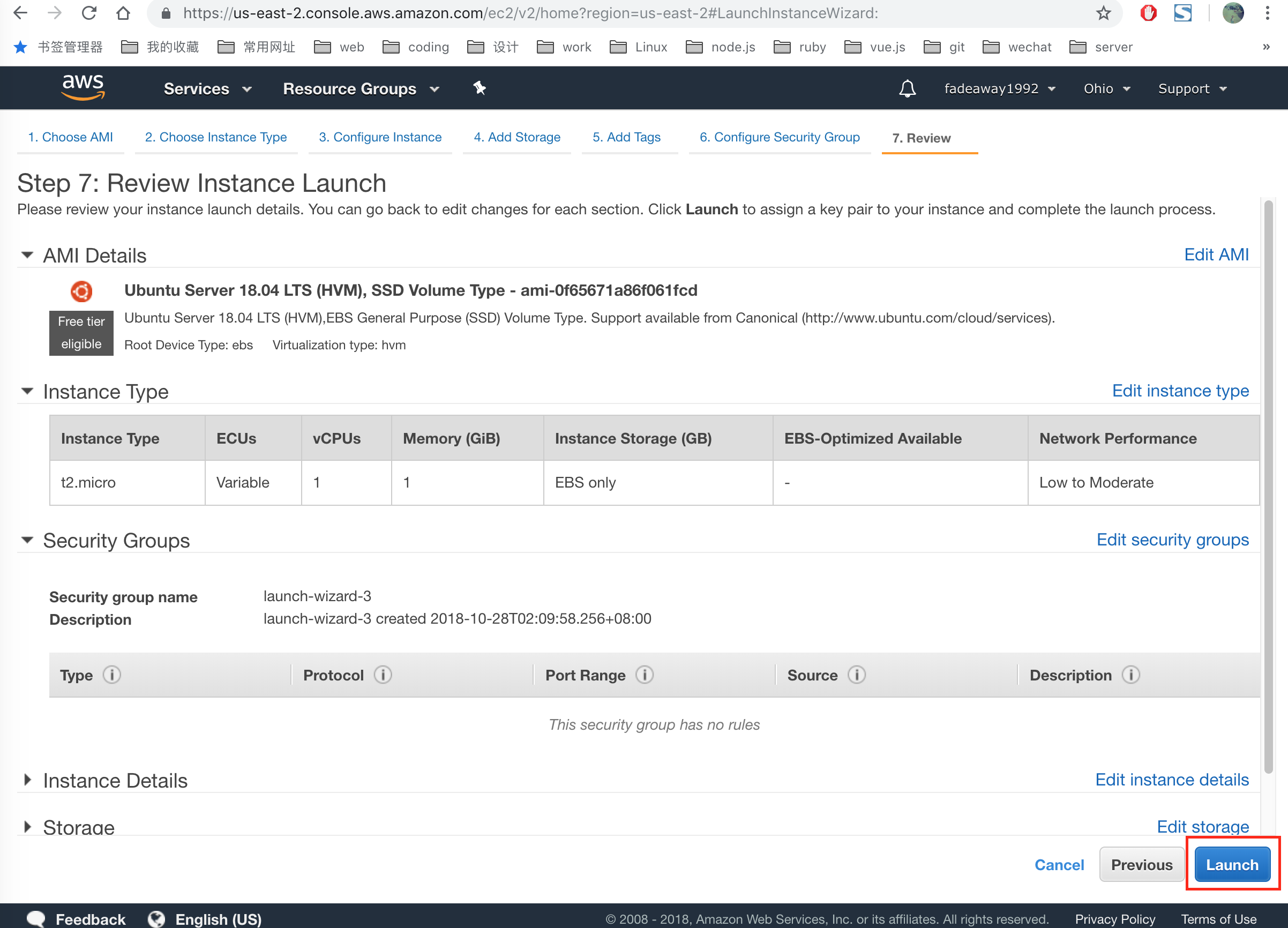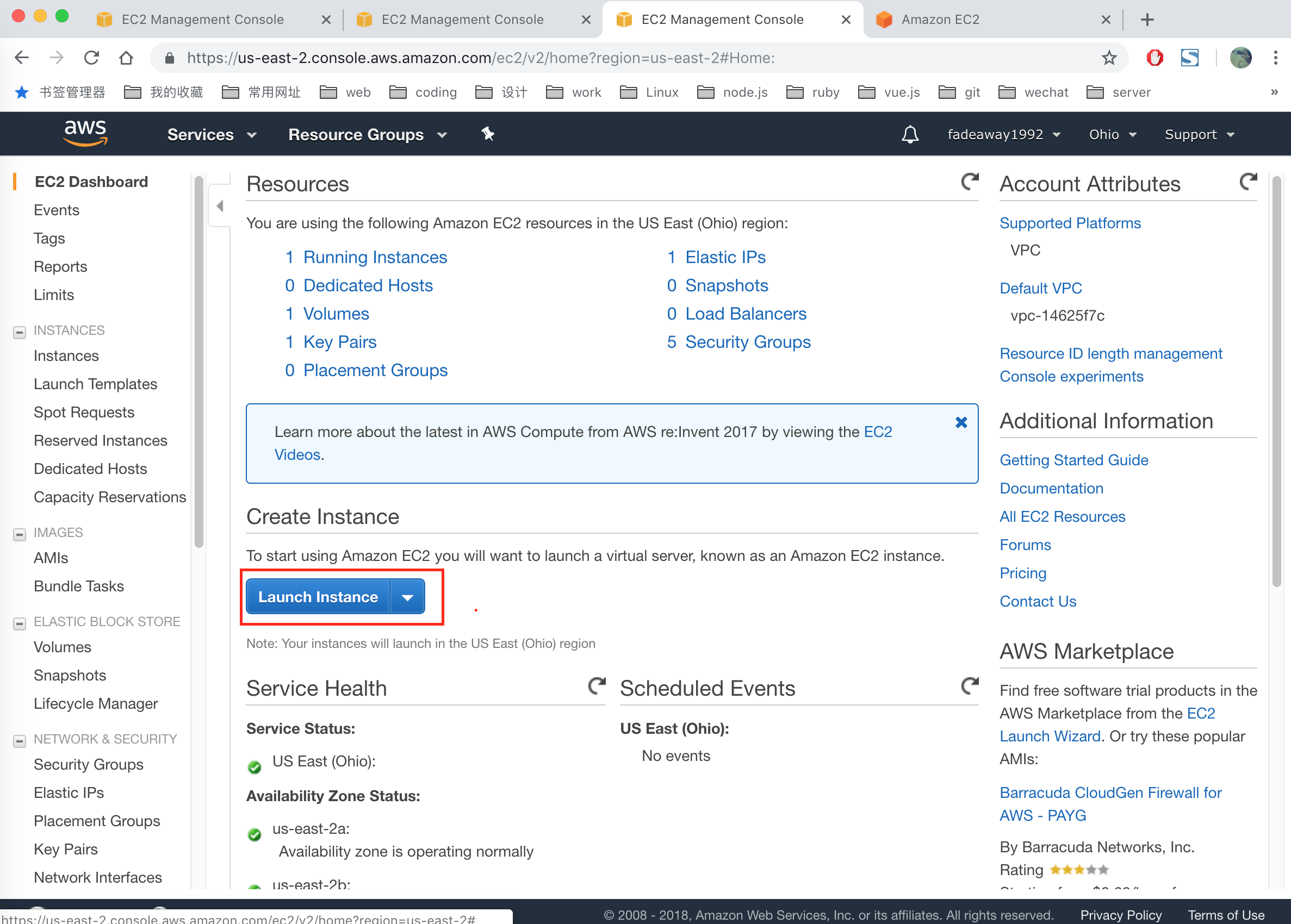 首先注册并登录 aws 账号,之后进到 EC2 服务的主页。像下面这样,点击红色区域的「Launch Instance」,开始建立实例。